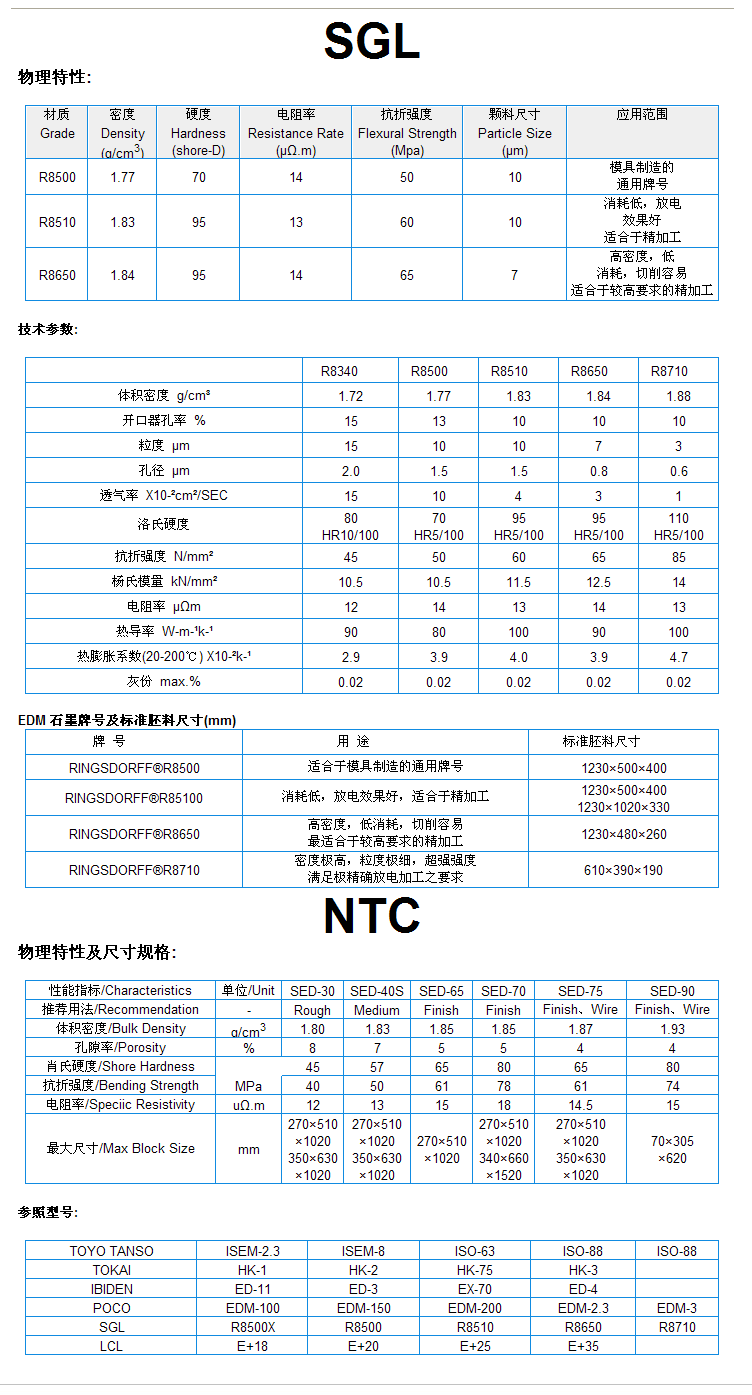 德國西格里石墨,日本東洋石墨,日本東海石墨,NTC石墨對應(yīng)牌號表及相關(guān)物理參數(shù),供參考