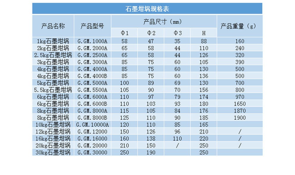 通常用石墨坩堝的人都知道石墨坩堝具有良好的熱導(dǎo)性和耐高溫性,在高溫使用過(guò)程中,熱膨脹系數(shù)小,對(duì)急熱、急冷具有一定抗應(yīng)變性能。對(duì)酸,堿性溶液的抗腐蝕性較強(qiáng),具有優(yōu)良的化學(xué)穩(wěn)定性。使用范圍:熔煉各種金、銀、銅、鋁、鉛、鋅等有色金屬及中碳鋼和稀有金屬。配套爐型:焦炭爐、燃油爐、天然氣爐、電爐、高中頻感應(yīng)爐等。那么石墨坩堝的尺寸有哪些呢?規(guī)格表有哪些,下面小編就來(lái)分享一下石墨坩堝尺寸表: